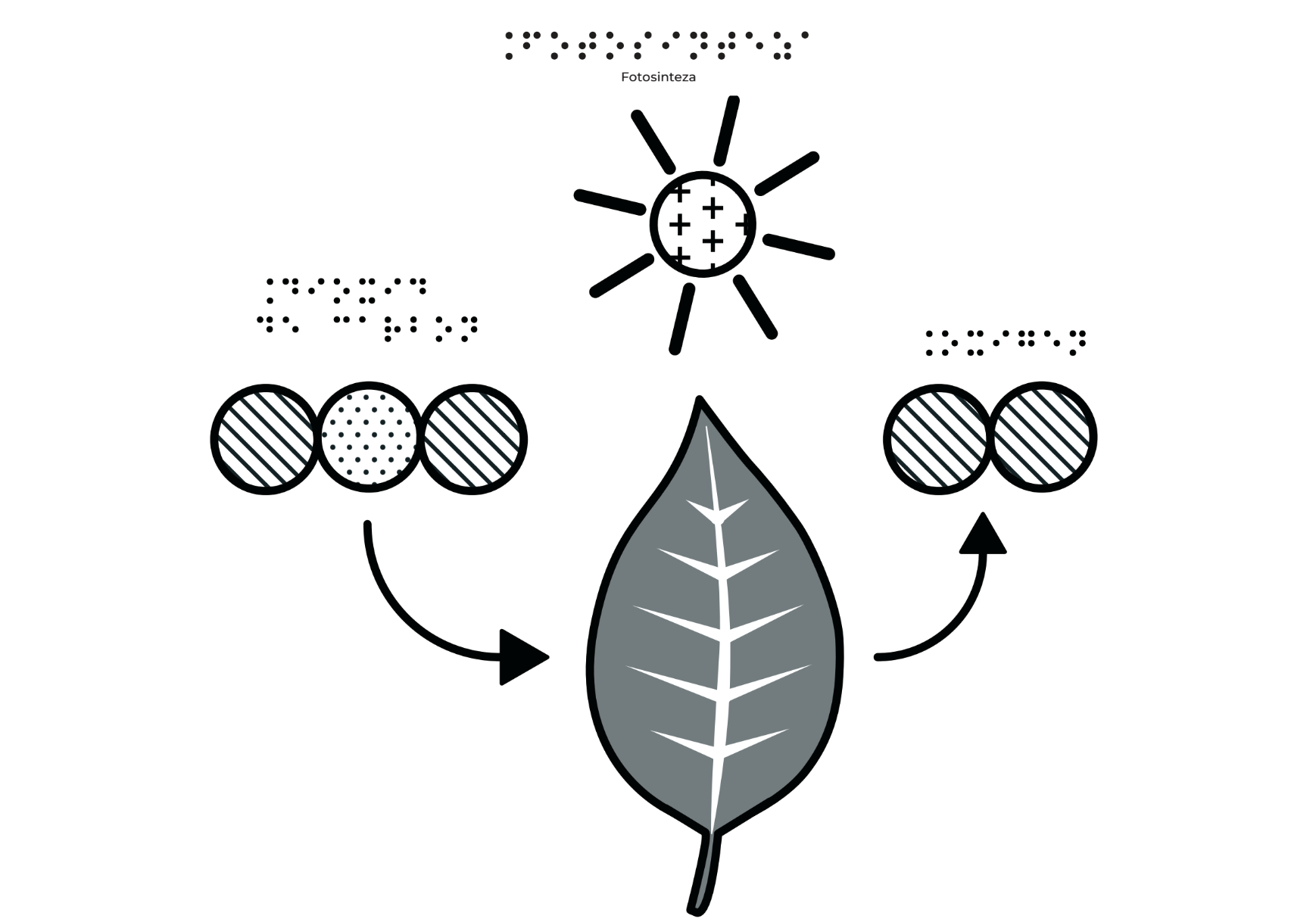 În partea stângă, trei cercuri cu texturi diferite (hașuri oblice și puncte) sunt dispuse într-un grup, cu o săgeată curbă îndreptată spre frunză, indicând substanțele care intră în procesul de fotosinteză. Deasupra acestora se află o etichetă în Braille.